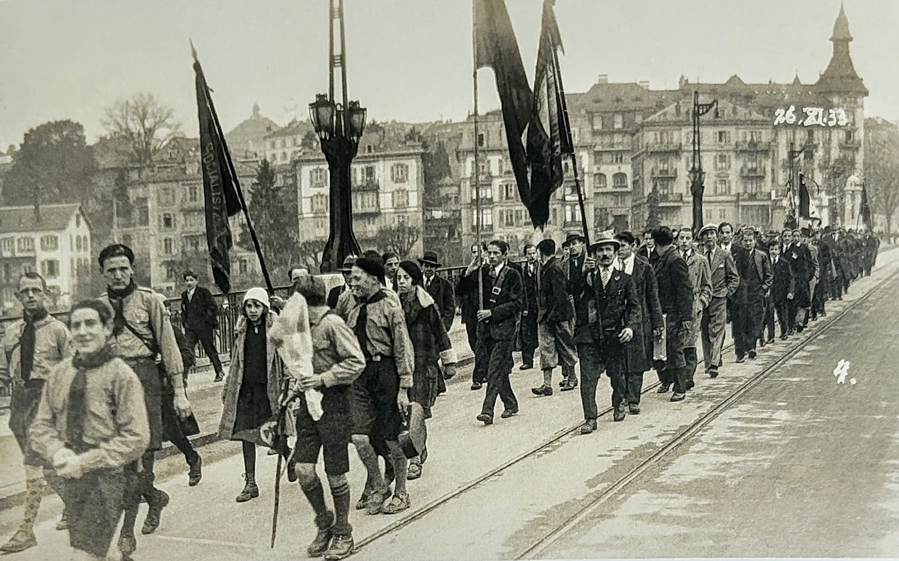 Cortège socialiste sur le pont Chaudron : Musée historique de Lausanne, Département des collections photographiques, Catalogue. 2007.